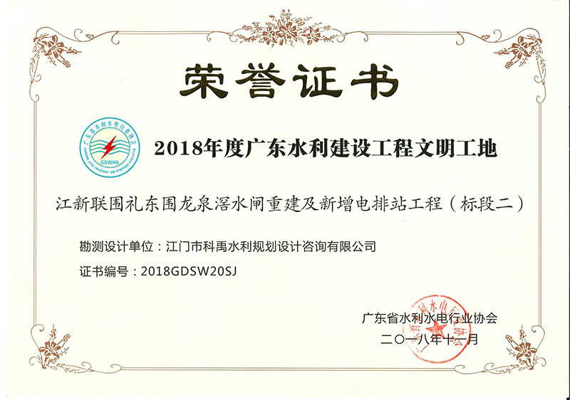 江新联围礼东围龙泉滘水闸重建及新增电排站工程荣获文明工地