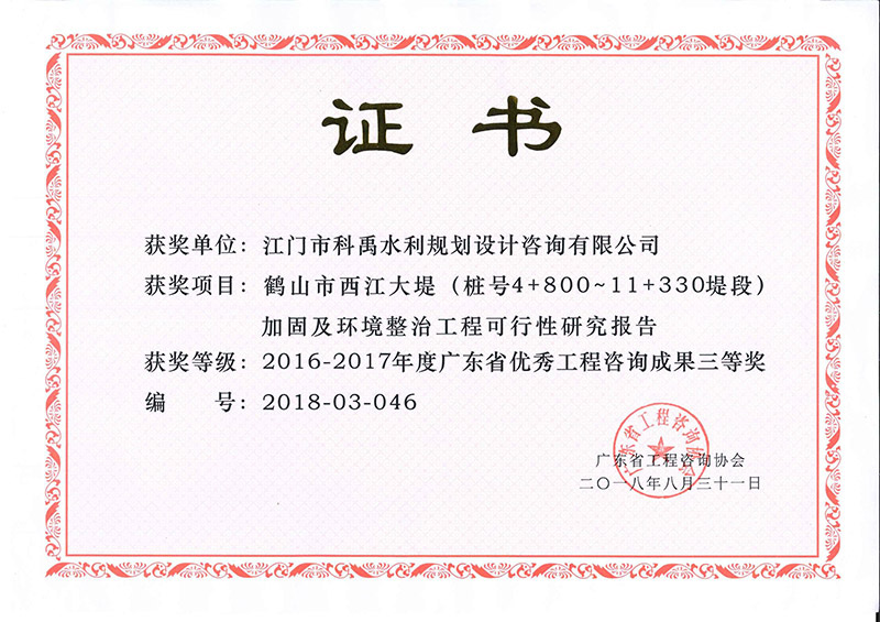 鹤山市西江大堤加固及环境整治工程可行性研究报告荣获省三等奖