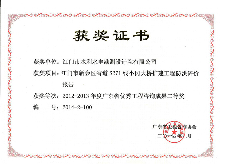 新会省道S271线小冈大桥扩建工程防洪评价获省优秀工程咨询二等奖