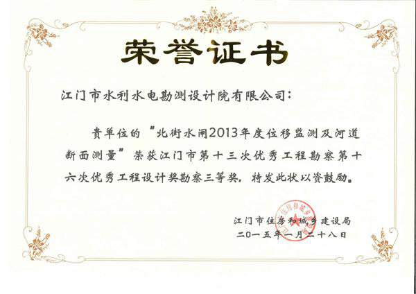 北街水闸2013度位移监测及河道断面测量获市勘察奖