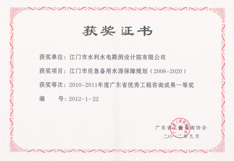 应急备用水源保障规划获广东省优秀工程咨询成果一等奖