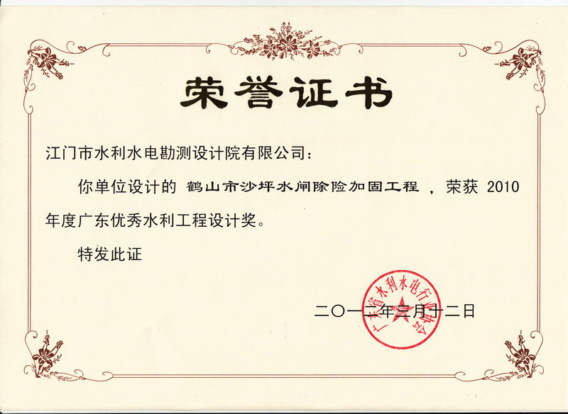 沙坪水闸荣获2010年度广东优秀水利工程设计奖