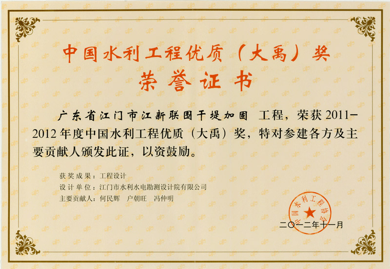 江新联围荣获2011-2012年度中国水利工优质(大禹)奖