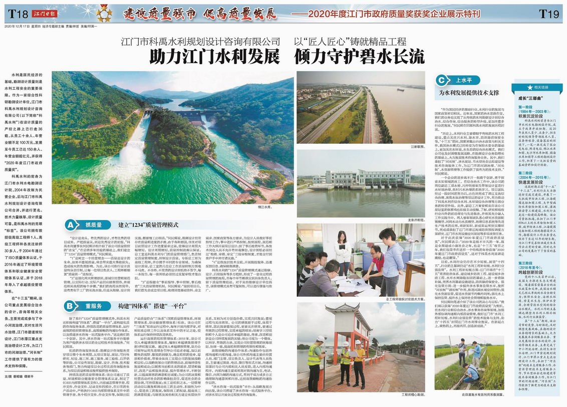 2020年12月21日,江门日报 《江门市科禹水利规划设计咨询有限公司以“匠人匠心”铸就精品工程 助力江门水利发展倾力守护碧水长流 》