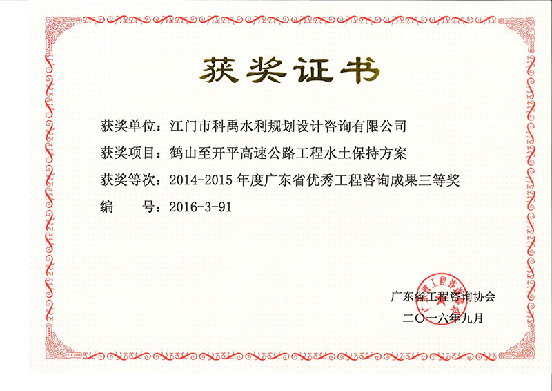 鹤山至开平高速公路工程水土保持方案获省优秀工程咨询成果三等奖