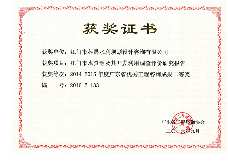 江门市水资源及其开发利用调查评价报告获省优秀工程咨询成果二等奖