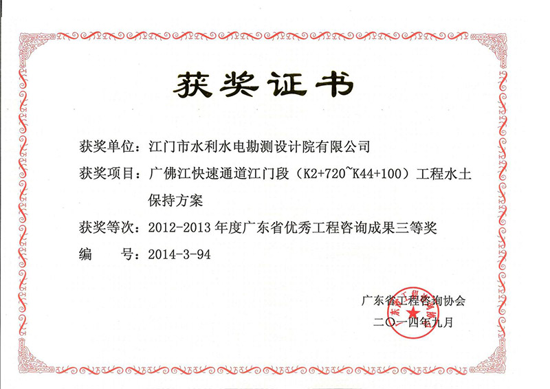 广佛江快速通道江门段工程水土保持方案获省工程咨询成果三等奖