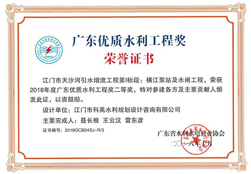 江门市天沙河引水增流工程第I标段荣获省优质水利工程奖二等奖