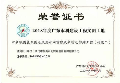 江新联围礼东围龙泉滘水闸重建及新增电排站工程荣获文明工地