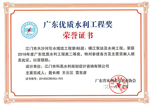 横江泵站及水闸工程荣获2018年度广东优质水利工程二等奖