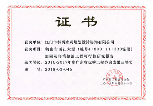 鹤山市西江大堤加固及环境整治工程可行性研究报告荣获省三等奖