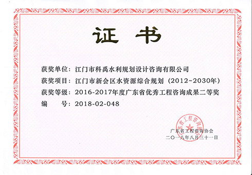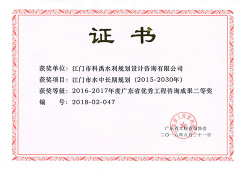 江门市水中长期规划(2015-2030年)荣获省优秀工程咨询成果二等奖
