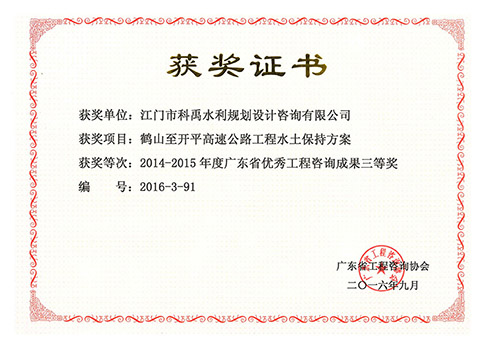 鹤山至开平高速公路工程水土保持方案获省优秀工程咨询成果三等奖