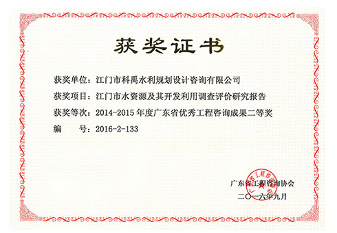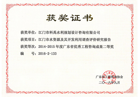 江门市水资源及其开发利用调查评价报告获省优秀工程咨询成果二等奖