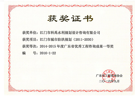 江门市城市防洪规划(2011-2030)获省优秀工程咨询成果一等奖