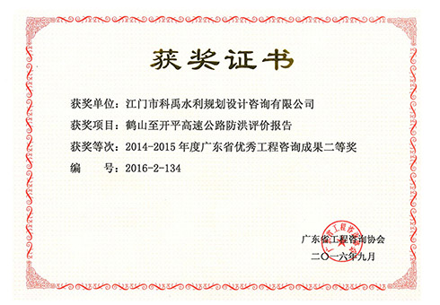 鹤山至开平高速公路防洪评价报告获省优秀工程咨询成果二等奖