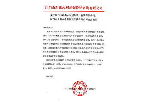 关于江门市科禹水利规划设计咨询有限公司、江门市水利水电勘测设计院有限公司合并的函