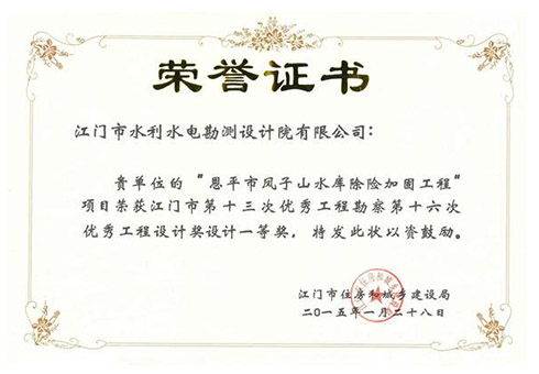 恩平市凤子山水库除险加固工程获市设计一等奖