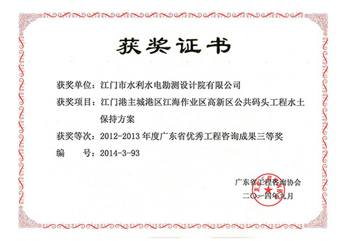 高新区公共码头工程水土保持方案获省优秀工程咨询成果三等奖