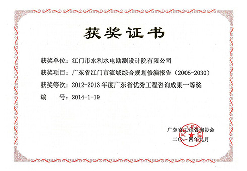 江门市流域综合规划(2005-2030)获省优秀工程咨询成果一等奖