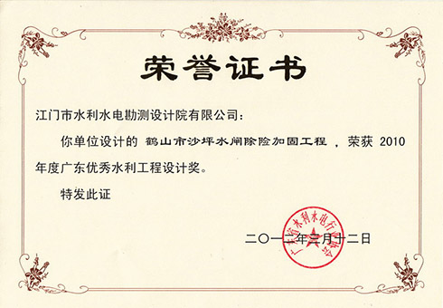 沙坪水闸荣获2010年度广东优秀水利工程设计奖