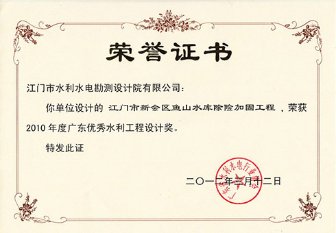 鱼山水库2010年度广东优秀水利工程设计奖