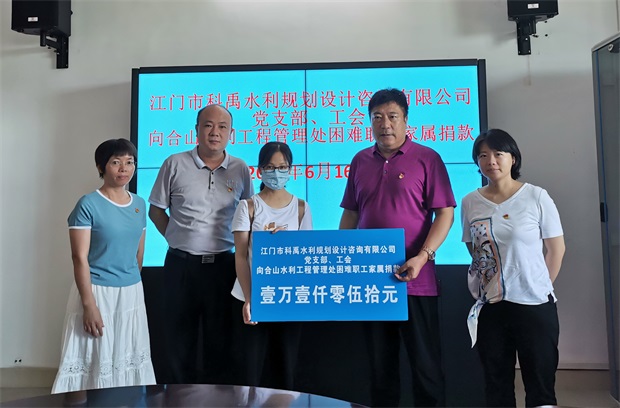 6月16日上午,科禹水利党支部书记户朝旺同志带着全体党员、职工爱心来到合山水利工程管理处,把科禹水利党支部、工会的爱心捐款交到困难职工家属手上。