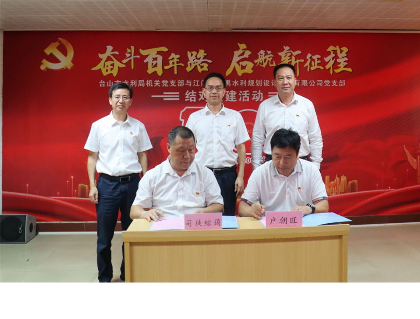 6月30日上午,江门市科禹水利规划设计咨询有限公司党支部与台山市水利局机关党支部举行以“奋斗百年路 启航新征程”为主题的结对共建活动。台山市直机关工委书记谭远东、工会主席李策航、台山市水利局党组书记、局长郑卓世、机关党支部书记、副局长司徒结蔼、江门市科禹水利规划设计咨询有限公司董事长何民辉、党支部书记户朝旺同志以及结对单位双方党员参加了此次活动。