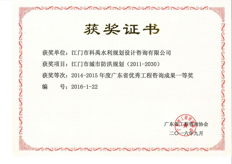《江门市城市防洪规划》获广东省优秀工程咨询成果一等奖