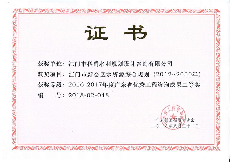 《新会区水资源综合规划》获广东省优秀工程咨询成果二等奖
