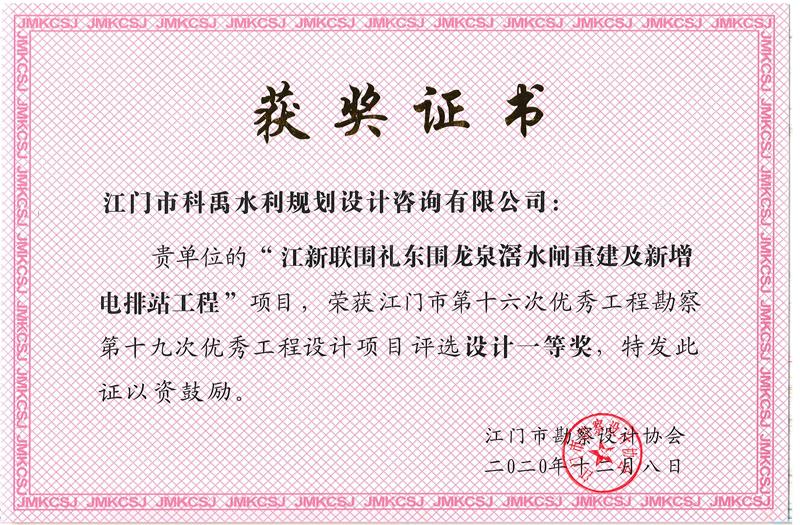 《江新联围礼东围龙泉滘水闸重建及新增电排站工程》获江门市优秀工程设计一等奖