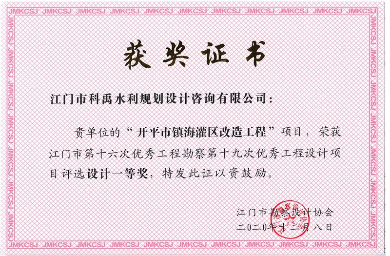 《开平市镇海灌区改造工程》获江门市优秀工程设计一等奖