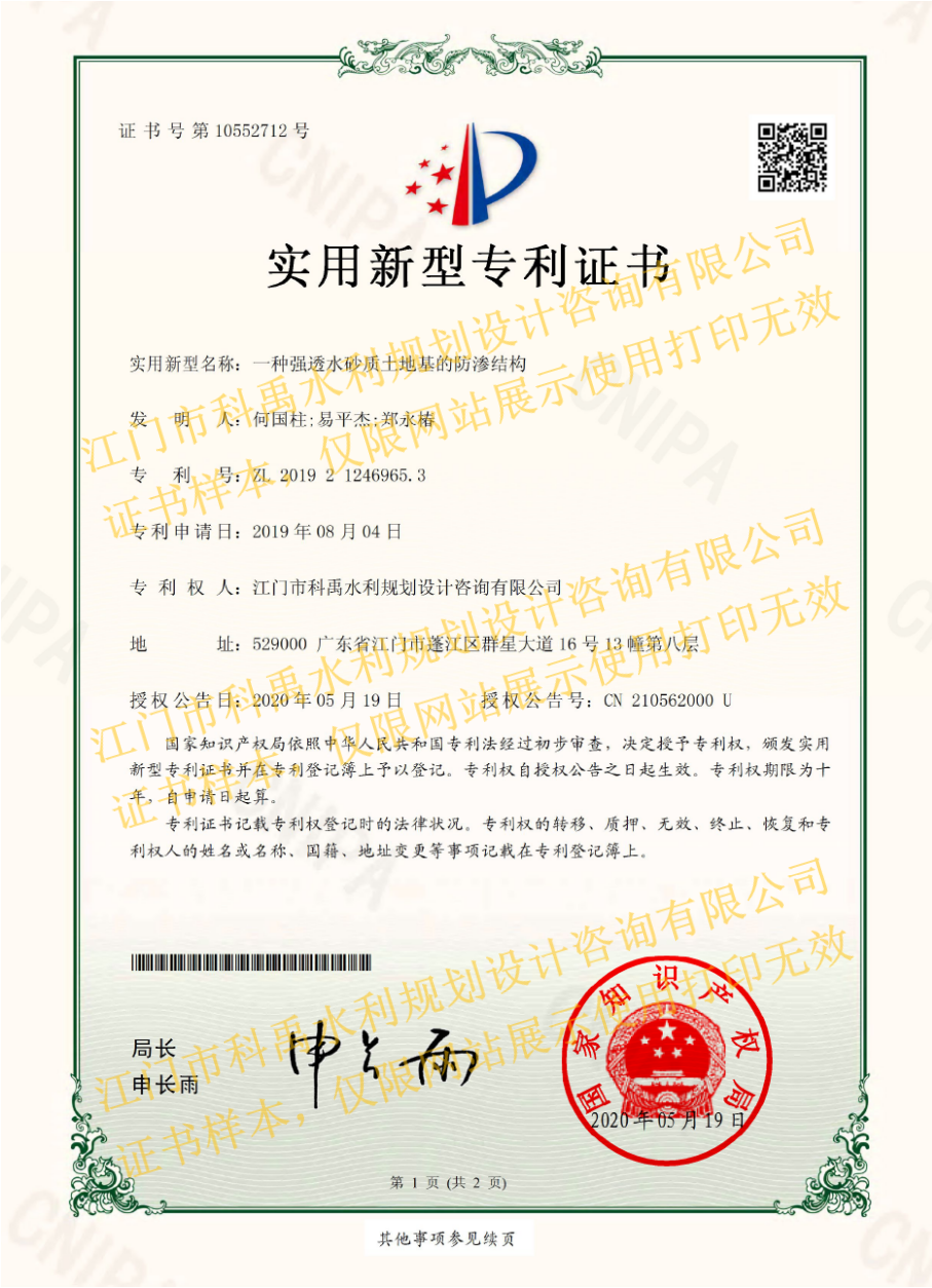 一种强透水砂质土地基的防渗结构实用新型专利证书