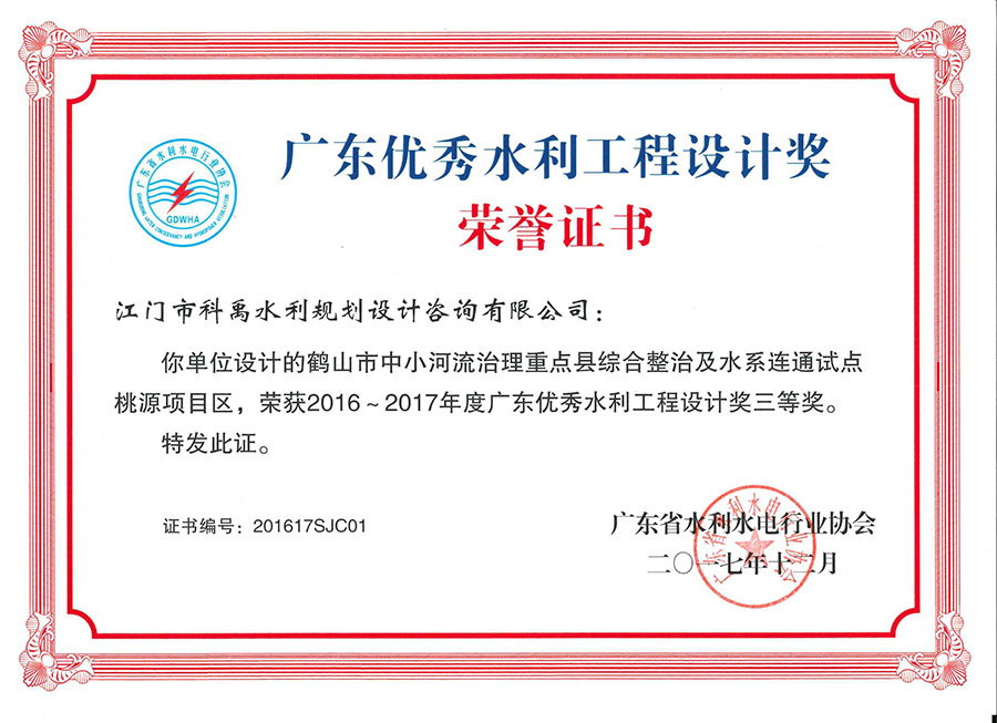 《鹤山市中小河流治理重点县桃源项目区项目》获广东省水利工程设计三等奖