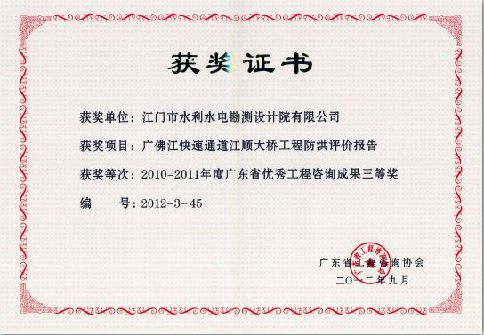 《广佛江快速通道江顺大桥工程防洪评价报告》获得“2010-2011年度广东省优秀工程咨询成果三等奖”