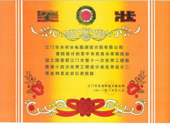 《恩平市良西水库除险加固工程》获得"江门市第十一次优秀工程勘察第十四次优秀工程设计奖优秀设计二等奖"