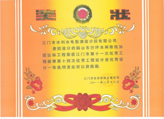 《鹤山市沙坪水闸除险加固达标工程》获得"江门市第十一次优秀工程勘察第十四次优秀工程设计奖优秀设计一等奖"