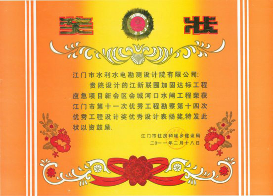《江新联围加固达标工程应急项目新会区会成河口水闸工程》获得“江门市第十一次优秀工程勘察第十四次优秀工程设计奖