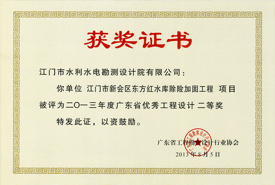 《江门市新会区东方红水库除险加固工程》获广东省优秀工程设计二等奖