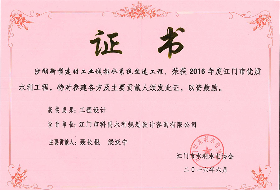 沙湖新型建材工业城排水系统改造工程获市优质水利工程设计奖