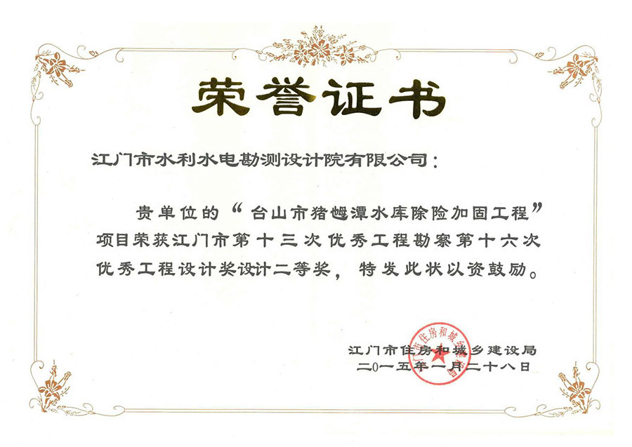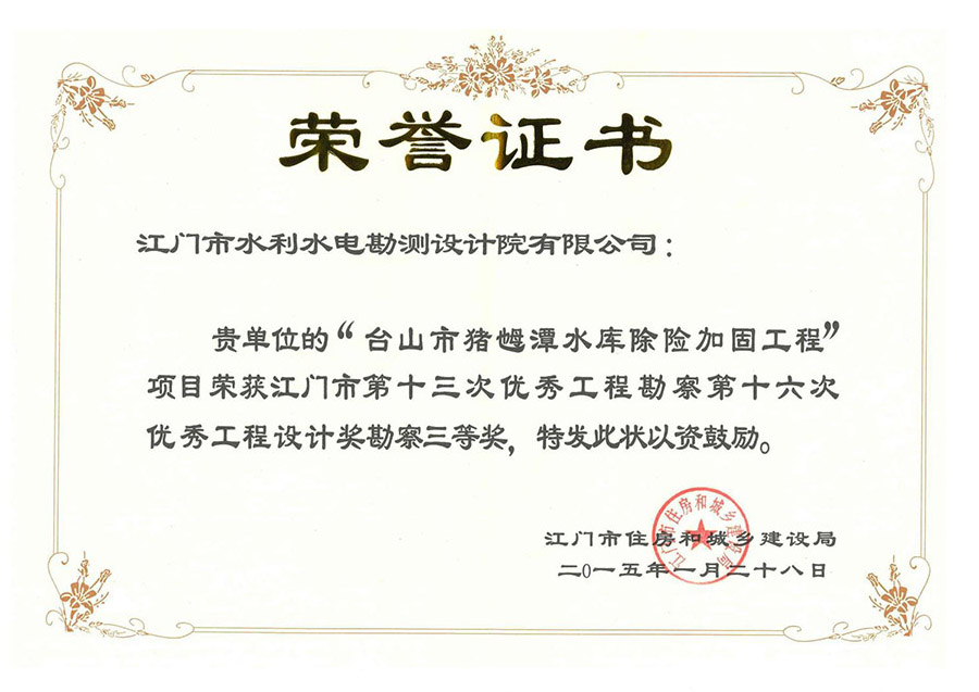《台山市猪乸潭水库除险加固工程》获得江门市设计、勘察奖