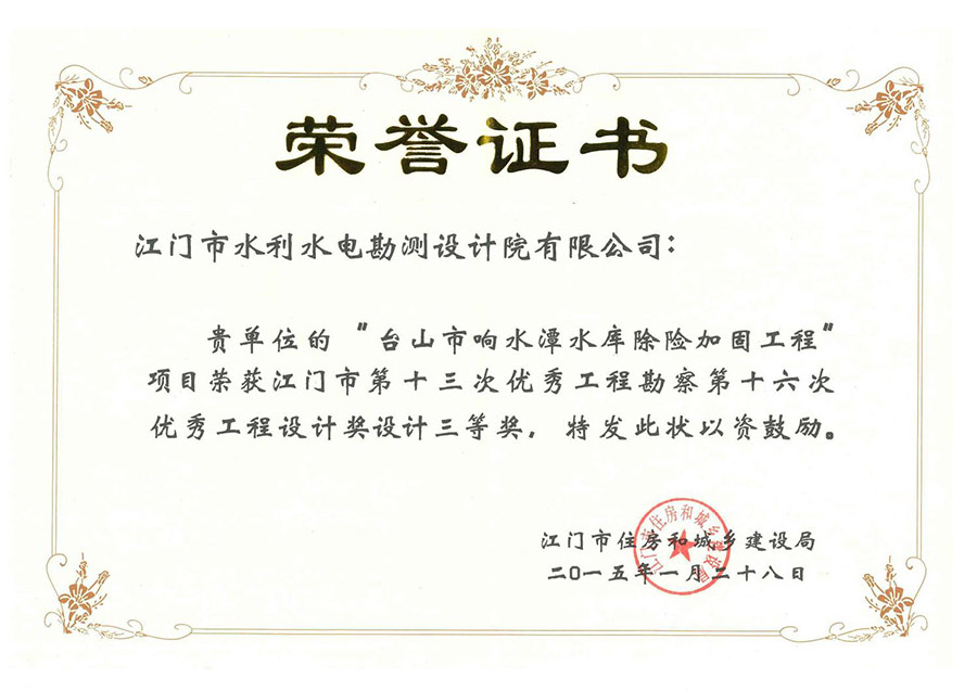 台山市响水潭水库除险加固工程获市设计奖